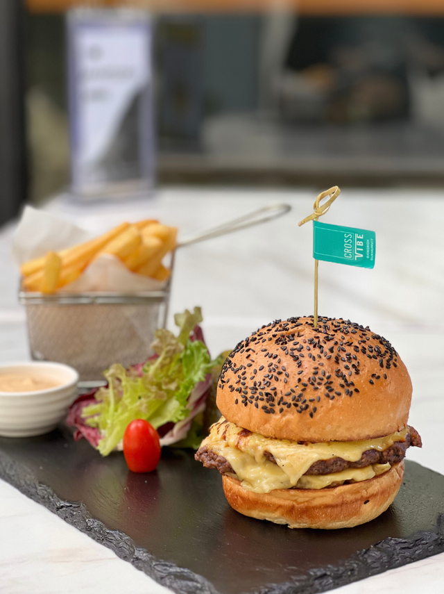 เมนูซิกเนเจอร์ของผมที่ 4K Café ในตอนนี้คือ Meaty Cheesy Truffle Burger ซึ่งเป็นดับเบิลสแมชเบอร์เกอร์ที่กรอบนอกนุ่มในครับ เราเพิ่มหอมใหญ่คาราเมลที่หวานและนุ่มละมุนลิ้น พร้อมด้วยทรัฟเฟิลดำ จากนั้นราดด้วยเชดดาร์ชีสละลาย และตกแต่งด้วยผักกาดหอมสดใหม่จากสวนออร์แกนิกของเราครับ