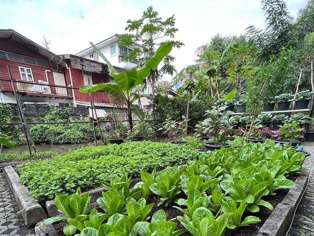 แรงบันดาลใจในการจัดสวนแห่งนี้เกิดขึ้นในช่วงการแพร่ระบาดของ {Covid-0} ครับ เดิมทีเริ่มจากการปลูกผักเพียงไม่กี่แปลงเพื่อใช้ในร้านอาหารและโรงอาหารของพนักงาน แต่ตั้งแต่นั้นมาก็ได้ขยายพื้นที่เพิ่มขึ้นครับ ผลผลิตออร์แกนิกของเราในปัจจุบันประกอบด้วยกะหล่ำปลี ผักกาดหอมเรดโอ๊คและกรีนโอ๊ค คะน้า ฟักทอง รวมถึงสมุนไพรต่าง ๆ เช่น ผักชี โรสแมรี สะระแหน่ และพริกครับ นอกจากนี้ เรายังเก็บเกี่ยวผลผลิตมะนาว มะละกอ กล้วยไม้ และดอกไม้กินได้ของเราเองด้วยครับ ความสดใหม่ของผลผลิตของเราช่วยให้เราสามารถรังสรรค์อาหารที่มีรสชาติอร่อยยิ่งขึ้นครับ